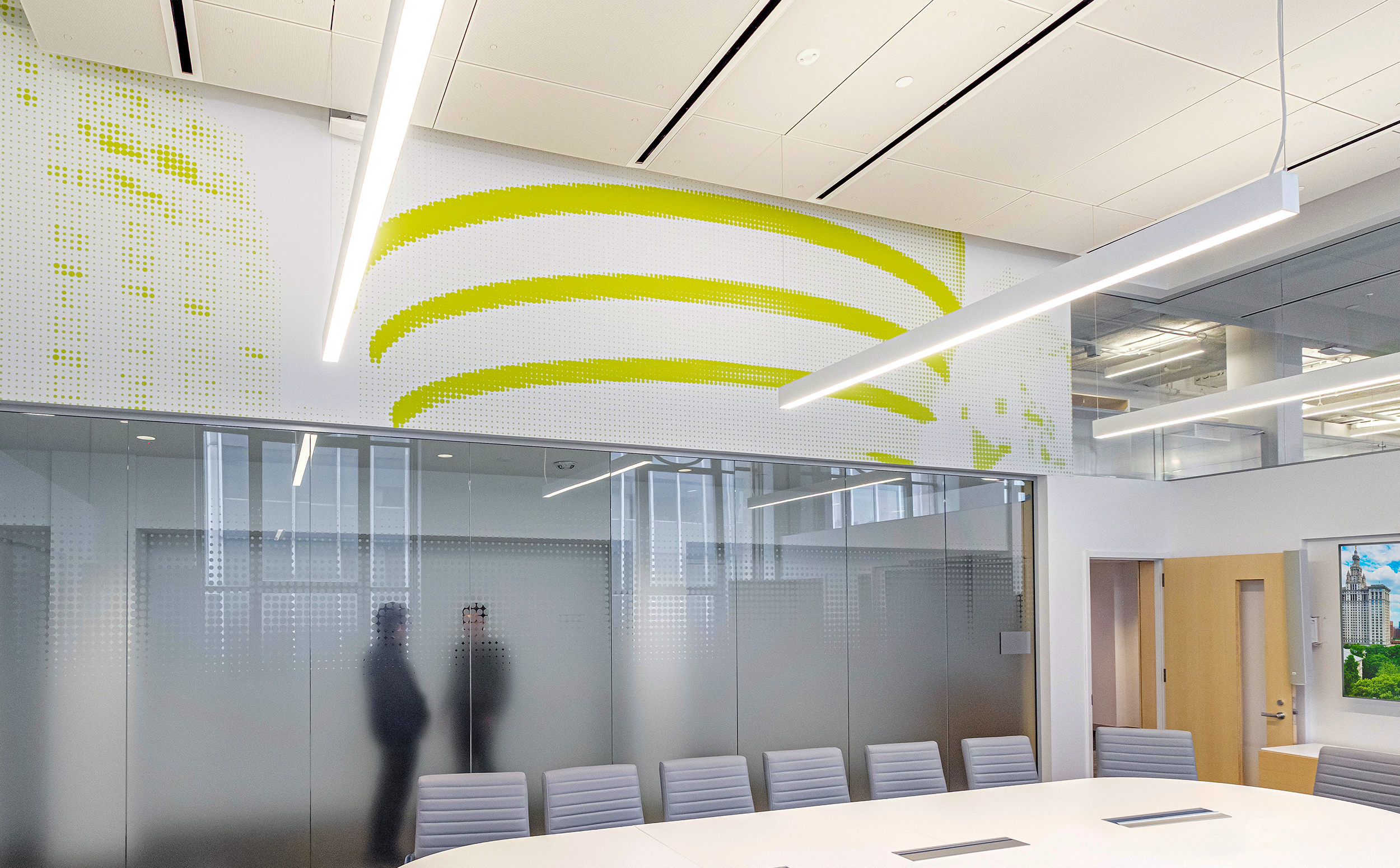 This motif appears throughout: applied to glass conference rooms as privacy film referencing historic windows; used in large-scale halftone murals of iconic landmarks; and embedded into signage, where rooms are named after notable NYC architectural styles.